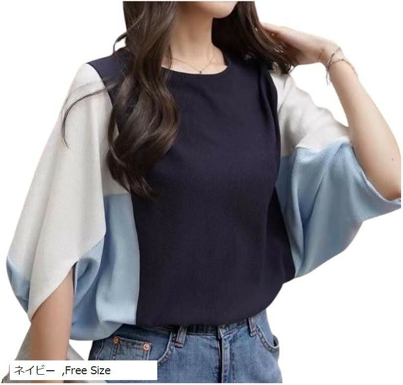 大人かわいい x 着回し力 ドルマンスリーブトップス 体型カバー 五分袖 カットソー レディース 春夏 全3色 (ネイビー, Free Size)