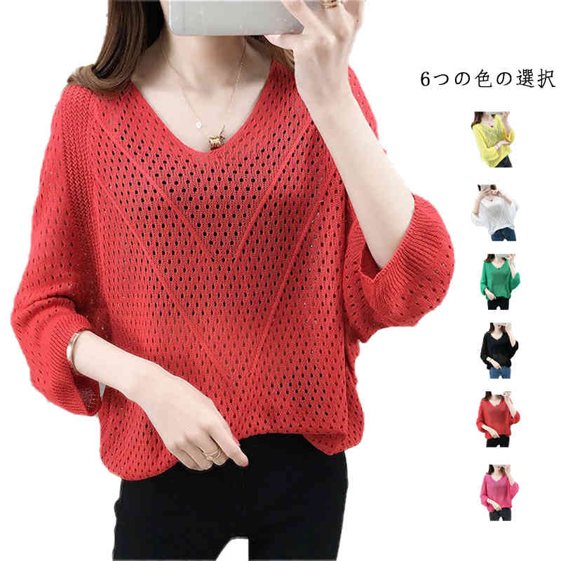 トップス vネック シアーニット レディース サマーニット vネック 透かし編み ブラウス 送料無料 可愛い ドルマンスリーブ 透け 透かし編み シャツブラウス 薄手 ゆったり ニップルオーバー おしゃれ カジュアル 大きいサイズ 体型カバー 送料無料 サマーニット 透かし編み