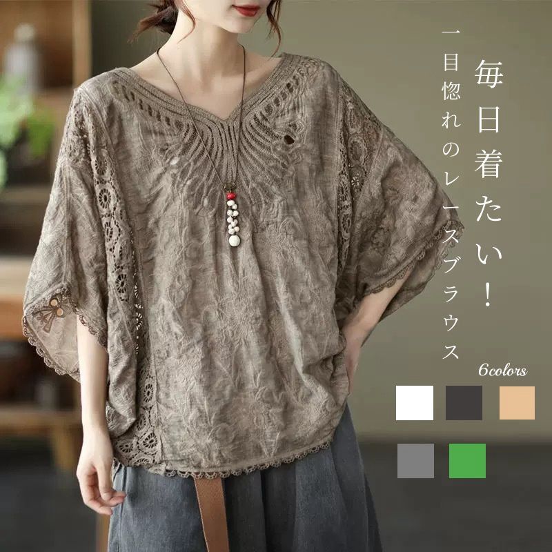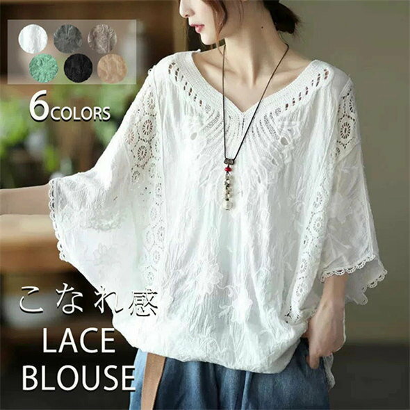 一部即納 ブラウス レディース レース シャツ ドルマンスリーブ Vネック 半袖 コットン UVカット 冷房対策 ゆったり 体型カバー 大人抜け感 可愛い おしゃれ 知的 カジュアル 普段着 夏