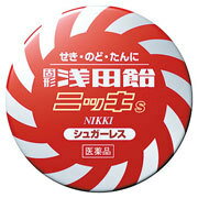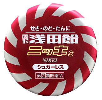 お買い上げいただける個数は5個までです リニューアルに伴いパッケージ・内容等予告なく変更する場合がございます。予めご了承ください。 名 称 浅田飴 固形浅田飴 ニッキS 50錠 【第(2)類医薬品】 内容量 50錠 特 徴 「浅田飴 固形ニッキ S 50錠」は、4種類の生薬(キキョウ根エキス、トコンエキス、マオウエキス、ニンジンエキス)を主成分とした、のどに長くとどまって作用する、ドロップタイプの鎮咳去痰薬。穏和でしかも服用しやすいのが特長です。 せき、たん、のどの痛みにすぐれた効果を発揮する、長い歴史のある薬です。シュガーレスのニッキ味です。医薬品。 効 能 効 果 せき、ぜんそく、たん、のどの炎症による声がれ・のどのあれ・のどの不快感・のどの痛み・のどのはれ 用法・用量 次の量を口中に含み、かまずにゆっくり溶かして服用してください。 ○大人(15才以上)・・・1回量2〜3錠、服用回数1日3回 ○8才以上15才未満・・・1回量2錠、服用回数1日3回 ○5才以上8才未満・・・1回量1錠、服用回数1日3回 ○5才未満・・・服用しないこと 成 分 9錠中 キキョウ根エキス・・・94.5mg マオウエキス・・・40.5mg トコンエキス・・・40.5mg ニンジンエキス・・・67.5mg 添加物として還元水アメ、還元麦芽糖水アメ、アセスルファムK、塩化Na、ケイヒ油、コハク酸2Na、アラビアゴム、カルナウバロウ、L-メントール、タルク、サラシミツロウ、赤色102号、黄色5号、青色1号、香料含有 区 分 指定第2類医薬品 ご注意 ●してはいけないこと (守らないと現在の症状が悪化したり、副作用・事故が起こりやすくなります。) 本剤を服用している間は、次のいずれの医薬品も服用しないでください。 他の鎮咳去痰薬、かぜ薬、抗ヒスタミン剤を含有する内服薬(鼻炎用内服薬、乗物酔い薬、アレルギー用薬)、鎮静薬。 ●相談すること 1.次の人は服用前に医師、薬剤師または登録販売者にご相談ください。 (1)医師の治療を受けている人 (2)妊婦又は妊娠していると思われる人 (3)高齢者 (4)本人又は家族がアレルギー体質の人 (5)薬によりアレルギー症状を起こしたことがある人 (6)次の症状のある人 高熱、激しいせき (7)次の診断を受けた人 心臓病、高血圧、糖尿病、甲状腺機能障害 2.次の場合は、直ちに服用を中止し、この説明書を持って医師、薬剤師または登録販売者にご相談ください。 (1)服用後、次の症状があらわれた場合 関係部位: 症状 ・皮ふ: 発疹・発赤・かゆみ ・消化器: 悪心・嘔吐・食欲不振 ・精神神経系: めまい (2)5-6回服用しても症状がよくならない場合 ■保管及び取扱い上の注意 (1)小児の手のとどかない場所に保管してください。 (2)直射日光をさけ、なるべく湿気の少ない涼しい場所にフタをしっかり閉めて保管してください。 (3)他の容器に入れ替えないでください。(誤用の原因になったり、品質が変わることがあります。) (4)使用期限(外箱に記載)を過ぎたものは服用しないでください。 ◆本品記載の使用法・使用上の注意をよくお読みの上ご使用下さい。 製造販売元 株式会社 浅田飴 東京都東村山市久米川町5-29-7 お問合せ 本剤について、何かお気付きの点がございましたら、お買い求めのお店又は下記までご連絡頂きますようお願い申し上げます。 株式会社浅田飴 お客様相談室 電話 03-3953-4044(ダイヤルイン) 時間 9:00-17:00(土、日、祝日を除く) 広告文責 株式会社ツルハグループマーチャンダイジング カスタマーセンター 047-409-4023 JANコード:4987206033352