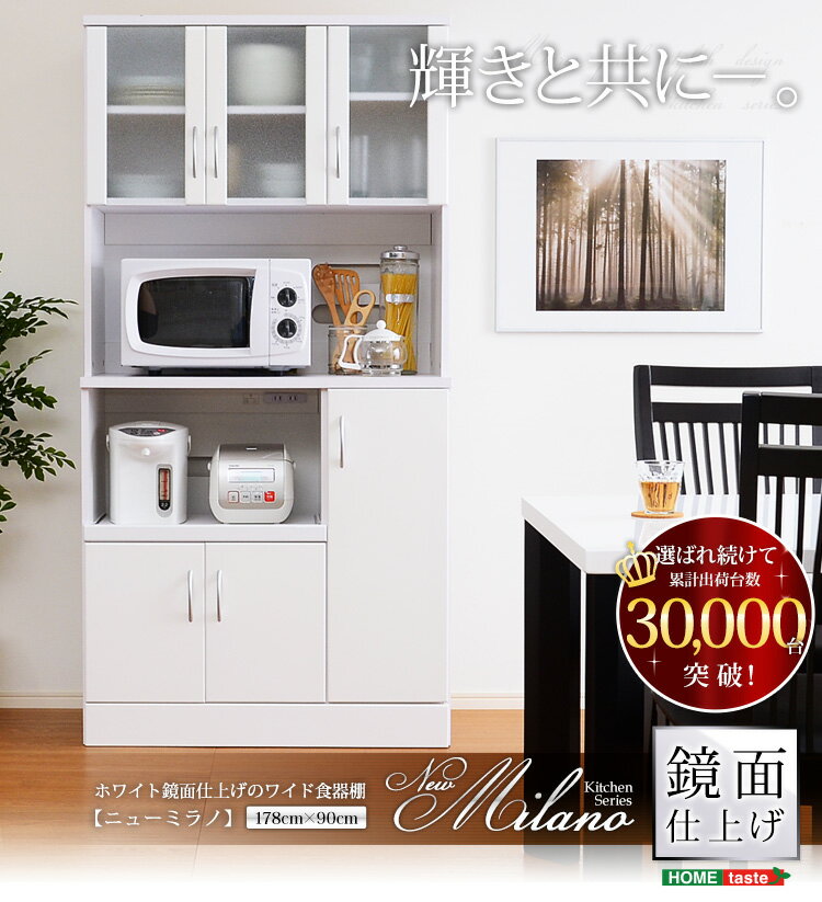 ホワイト鏡面仕上げのワイド食器棚 キッチン収納庫 ホワイト色 1台 1890--TU ◆180cm×90cm ◆レンジや家電も一緒に収納可能 ◆お客様組立商品 ニューミラノ NewMilano