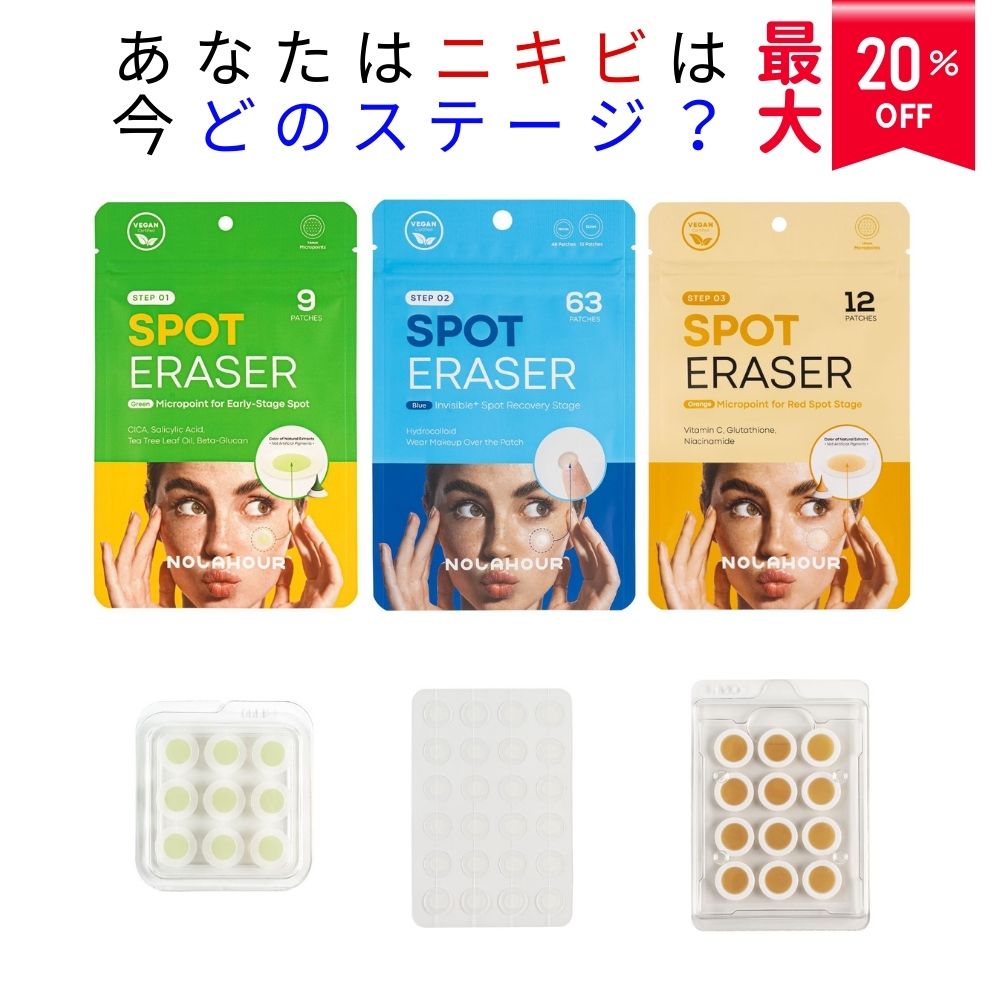 商品情報広告文責(会社名・電話番号)株式会社ファインドレイズインターナショナル TEL06-6318-5987内容量合計84枚入りグリーン9枚ブルー63枚オレンジ12枚メーカー名、又は販売業者名Depack Corporation生産国大韓民国全成分(化粧品のみ)【スポットイレーザーグリーン】ヒアルロン酸Na、ブチレングリコール、ベニバナ花エキス、トレハロース、デキストリン、クチナシエキス、パンテノール、サリチル酸、ジメチルスルホン、ティーツリー葉油、マデカソシド、二カリウムグリチルリチン酸、セイヨウトチノキエキス、1,2-ヘキサンジオール、グリセリン、緑茶エキス、β-グルカン、緑茶カテキン【スポットイレイザーブルー】ポリイソブテン、セルロースガム、水添スチレン/メチルスチレン/インデンコポリマー、ペクチン【スポットイレイザーオレンジ】ヒアルロン酸ナトリウム、グルタチオン、グリセリン、プロパンジオール、クチナシエキス、ナイアシンアミド、デキストリン、トレハロース、3-0-エチルアスコルビン酸、ビワ葉エキス、マデカソサイド、1,2-ヘキサンジオール、スペアミントエキス、アルファビサボロール商品区分化粧品使用方法【スポットイレイザーブルー】(1)肌を清潔にし、水分をしっかり拭き取ってから気になる部分のサイズに合わせてしっかりとパッチを貼ってください。(2)パッチが白くなったら交換してください。(※パッチの上からお化粧をすることは可能です。)【スポットイレーザーグリーン・レッド】(1)就寝前、肌を清潔にし、気になる部分にしっかりとパッチを貼ってください。(※パッチの中央部分には触れないでください。)(2)翌朝パッチをはがしてください。NOLAHOUR ノラアワー 3ステップ スポットイレイザー(グリーン9枚/ブルー63枚/オレンジ12枚) マイクロニードル 昼用 夜用ニキビパッチ 韓国ニキビパッチ 吹き出物 正規輸入品 ニキビのステージで使い分ける3種類のニキビパッチ。初期段階はグリーン、治りかけ段階はブルー、最終の赤ニキビはオレンジ スポットイレイザー 3ステップケアとは?ニキビの進行段階に合わせて使い分ける、集中スポットケアパッチシリーズです。「できる前 → 触った後 → 赤みが残る時」までを3段階でサポートし、無駄な刺激を与えず、必要なケアだけを的確に届けます。STEP1|スポットイレイザー グリーン〈できかけ・初期ニキビ用/夜用〉【目的】ニキビが表面化する前の違和感・ごわつきにアプローチ。【特長】マイクロニードルが美容成分を角質層まで直接届ける設計サリチル酸、マデカッソシド、MSM配合初期段階のニキビを落ち着かせ、目立ちにくく整える使用シーン「なんとなく痛い」「赤くなりそう」そんな夜に。STEP2|スポットイレイザー ブルー〈潰した後・保護ケア/日中使用可〉【目的】開いた毛穴や患部を外的刺激から保護しながらケア。【特長】ハイドロコロイド処方で分泌物を吸収薄く透明でメイクの上からも目立ちにくい優れた密着力で日中も安心【使用シーン】潰してしまった後、外出中、メイク時の保護に。STEP3|スポットイレイザー オレンジ〈赤み・色残りケア/夜用〉【目的】ニキビ後の赤み・色ムラを明るく整える集中ケア。【特長】マイクロニードルにナイアシンアミド、トラネキサム酸、ビタミンCを配合寝ている間に角質層へじっくり浸透赤みが気になる部分をなめらかで均一な肌印象へ【使用シーン】治った後の赤み・ポイントケアに。 5