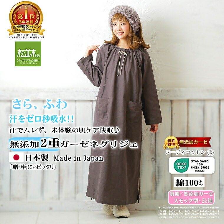 楽天1位★松並木 無添加 2重ガーゼ ネグリジェ 快適! 快眠! 長袖 スモック型 カラー4色 肌に優しい 化学物質不使用【日本製】綿100%【汗を吸水 さらふわ チクチクしない 肌さら】アトピー 敏感肌にも優しい/エコテックス認証 ヌーディコットン ストレス軽減 健康 ナイティ