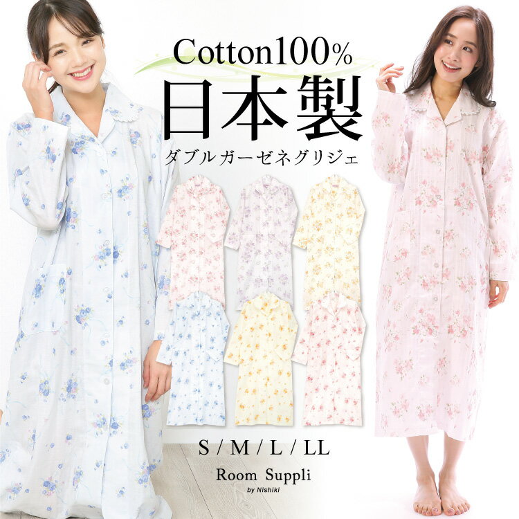 \半額クーポンで3,990円⇒1,995円/ ネグリジェ 日本製 綿100% 母の日 前開き 長袖 花柄 ダブル ガーゼ コットン100% 二重ガーゼ ワンピース ロング丈 入院 産後 マタニティ S M L LLサイズ RoomSuplli ルームサプリ 敬老の日 49563 77505 49563all 圧縮