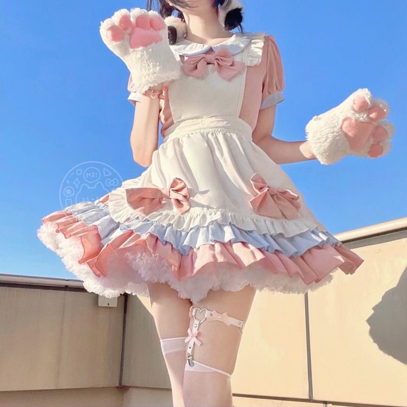 メイド服 可愛い 猫 ピンク 青 リボン 半 長 袖 ワンピース パフスリーブ コスプレ ハロウィン クリスマスパーティー フリフリ スカート ミニ丈 大きいサイズ