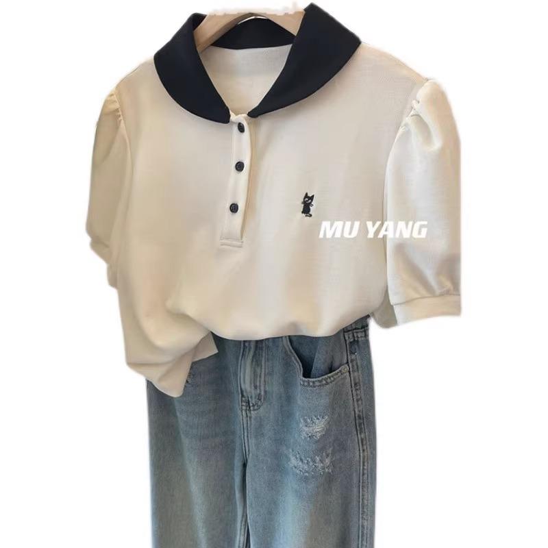 ポロシャツ キッズ 半袖 夏 女の子 ジュニア トップス ゆったり パフスリーブ シンプル カジュアル スタイリッシュ 黒 白 グレー ネコ 刺繍