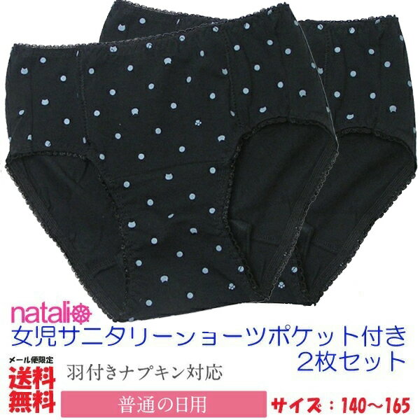 【在庫限り!【もう入荷無しです】ガールズ キッズ サニタリーショーツ 生理用ショーツ ジュニア / 女児 昼用 ポケット付き 羽根つき対応 かわいい猫ドット柄2枚セット / 【メール便送料無料】