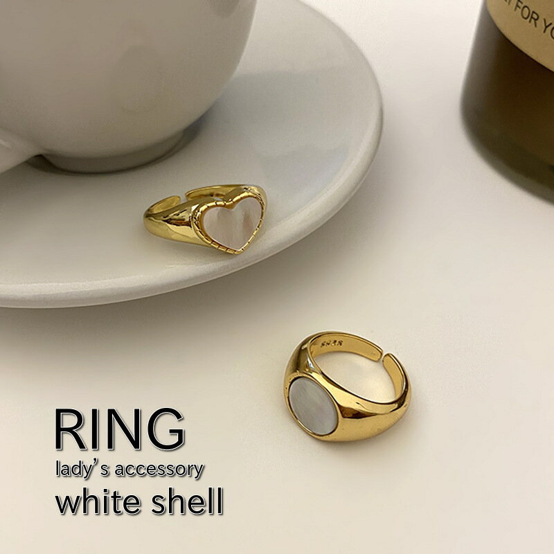 リング 指輪 フリーサイズ ホワイトシェル 白蝶貝 シルバー925 銀 ゴールド 金属アレルギー対応 アクセサリー レディース ジュエリー 重ね付け シンプル 太め おしゃれ 大人かわいい 白蝶貝がはめ込まれた上品なデザインリング 透き通った自然な輝きが魅力の白蝶貝がはめ込まれた上品なデザインリングです。シンプルなラウンド型、キュートなデザインでカジュアルに合わせやすいハート型の2タイプをご用意しました。シルバー素材ならではの光沢感を出しつつ、立体的で洗練されたフォルムに仕上がっています。フリーサイズのオープンタイプなのでご自身で調整ができ、つける指もその日の気分で変えていただけます。お持ちのリングと合わせて、重ね付けもおすすめです。◆種類 タイプA:ハート(ゴールド) / タイプB:ハート(シルバー) タイプC:ラウンド(ゴールド) / タイプD:ラウンド(シルバー)◆素材 スターリングシルバー925(プラチナカラーコーティング)※入荷時期により「S925」「925」の刻印がない場合がございます。◆サイズ 【ハート型】トップ幅 約8mm / 直径 約20mm フリーサイズ(目安11号〜) 【ラウンド型】トップ幅 約10mm / 直径 約21mm フリーサイズ(目安14号〜) ※ご自身で調整可能 ゆっくりと広げていただくことで、幅広い方にフィットします。 5