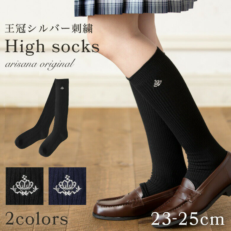 ハイソックス 女の子 スクールソックス 靴下 キッズ ジュニア 学生 フォーマル 23-25 王冠刺繍 綿混リブ 黒 ブラック 通学 卒業式 入学式 結婚式 arisana メール便可