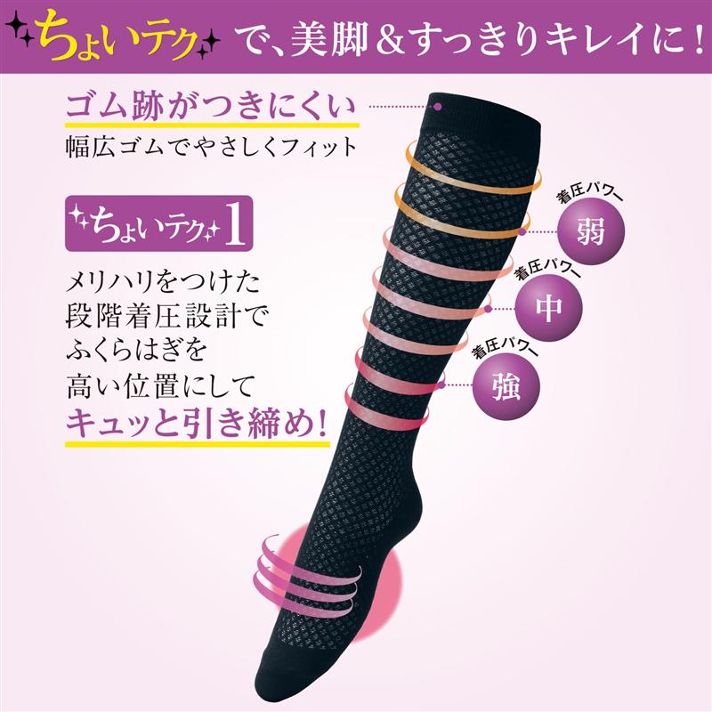 ストライプ柄ダイヤ柄ヘリンボーンストライプ柄メッシュ柄マルチストライプ柄ミニダイヤ柄 ■こんな方におすすめです ・立ち仕事の方・履きやすい着圧ソックスをお探しの方 ■おすすめポイント メリハリ段階着圧設計で脚をキュッと引き締め ・美脚見せを叶えるオトナ柄を厳選 ・土踏まずを編み地がキュッと刺激美脚&すっきりキレイを叶える「オトナ柄」の着圧ハイソックス。 ・ふくらはぎを高い位置にして脚長効果を発揮。 ・毛羽を抑えた綿素材の機能糸を表糸に使用しているので、柄もきれいに見えます。 ・足口は幅広ゴムで跡がつきにくく、天然有機系デオドラント加工でニオイ対策も◎。 ・脚をほっそり見せるおしゃれな柄は、日本製ならでは! ●綿、ナイロン、その他●日本製