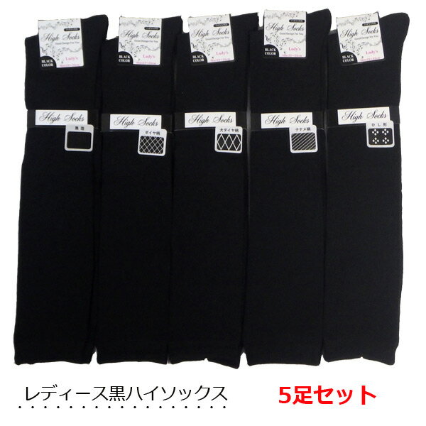 ハイソックス レディース 5足セット 黒 36cm丈 平無地 地柄 靴下 ひざ下 通勤 通学
