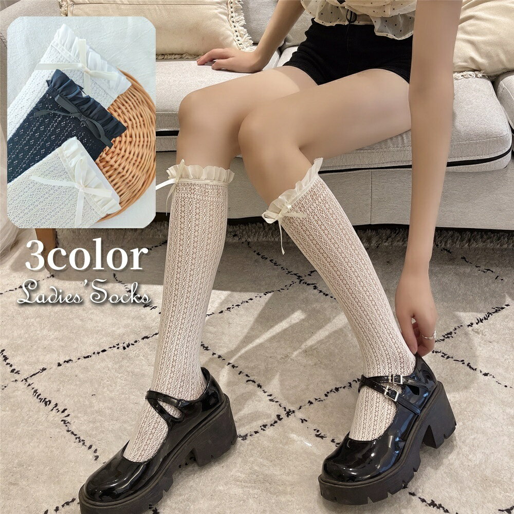 送料無料 ハイソックス レディース 女性用 靴下 くつした くつ下 レース リボン フリル おしゃれ かわいい キュート ガーリー ロリータ系 甘ロリ プリンセス 姫系 コスプレ 透け感 ホワイト ブラック クリーム 婦人用