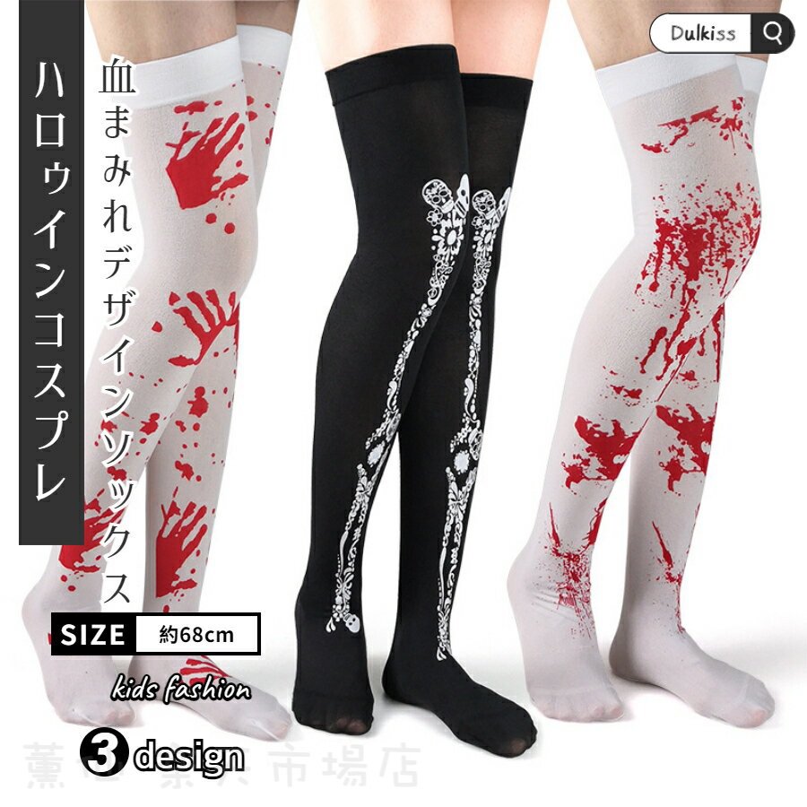 ハロウィン ニーハイ ソックス 靴下 仮装 コスプレ 衣装 ダンス イベント 舞台 余興 パーティー ナース 血 コウモリ 骨 トランプ 手形 ホラー リボン セクシー キュート カラフル 血まみれ 靴下 ハロウィン 血糊 血のり 返り血 プリント ニーハイソックス