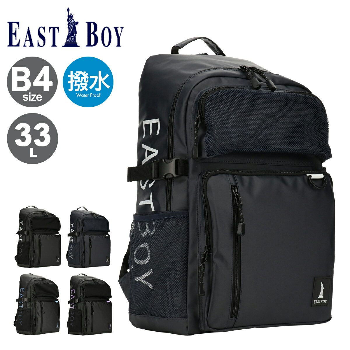 ITEM SPEC COLOR VARIATION ブランド:EASTBOY イーストボーイ サイドにあしらったブランドのロゴにはラメを施し女子中高生の「可愛い」を刺激するデザインとなっています。 サイズ:約W33×H47×D17cm対応サイズ:B4容量:約27L重量:約669gショルダー長さ:約50~90cm(取り外し不可) カラー:【05】ホワイト【60】ネイビー【64】サックス【74】パープル 素材:ポリエステル(TPU加工)裏地:ポリエステル 仕様:ダブルファスナー式開閉内側:ベルクロ付きウレタンポケット×1ファスナーポケット×1フリーポケット×2キーフック×1前面:ファスナーポケット×1ファスナーメッシュポケット×1背面:ファスナーポケット×1側面:メッシュポケット×2チェストベルト 備考:濡れた場合は放置せずに乾いた布でサッとふき取ってください。 ご注意ください: ● 商品の画像は、できるだけ商品に近いカラーにて掲載をしております。 お客様のモニターの発色または設定により、実際の色味と異なる場合もあります。あらかじめご了承ください。 ● メーカーサイズ、もしくは実際に測った寸法となります。商品の素材等の個体差により、若干サイズのばらつきがあります。サイズはあくまでも目安としてお考えください。 ● 天然皮革・素材を使用している商品によっては、天然素材の特性上、部位により風合いやシミ・シワ感や焦げ、濃淡など多少の個体差がある場合があります。あらかじめご了承ください。