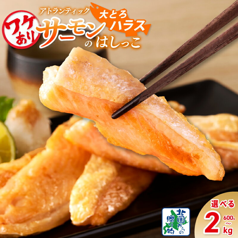 【ふるさと納税】【訳あり】 総量600g 〜 2kg アトランティックサーモンの大とろハラス 200g×3P / 5P / 8P / 10P 小分け 鮭ハラス 腹ヒレ肉 昆布塩加工 はしっこ 人気 希少 ハラス 鮭 サーモン BBQ 海鮮 送料無料 網焼き ハラミ 腹びれ 丼