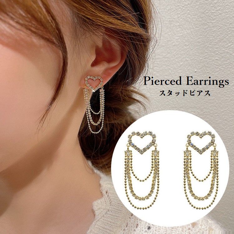 送料無料 スタッドピアス キャッチピアス レディース アクセサリー 耳飾り 3連チェーン ハート型 ラインストーン 揺れる 可愛い おしゃれ 女性用 婦人用 服飾小物 プレゼント 誕生日 記念日 贈り物 ギフト