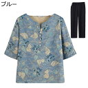 上下 セット Tシャツ 半袖 カットソー チュニック 葉柄 ハーフボタン ロングパンツ 七分丈 高齢者 シニアファッション お婆ちゃん服 ゆったり 夏 薄手 通気性 ホーム お出かけ リゾート 50代 60代