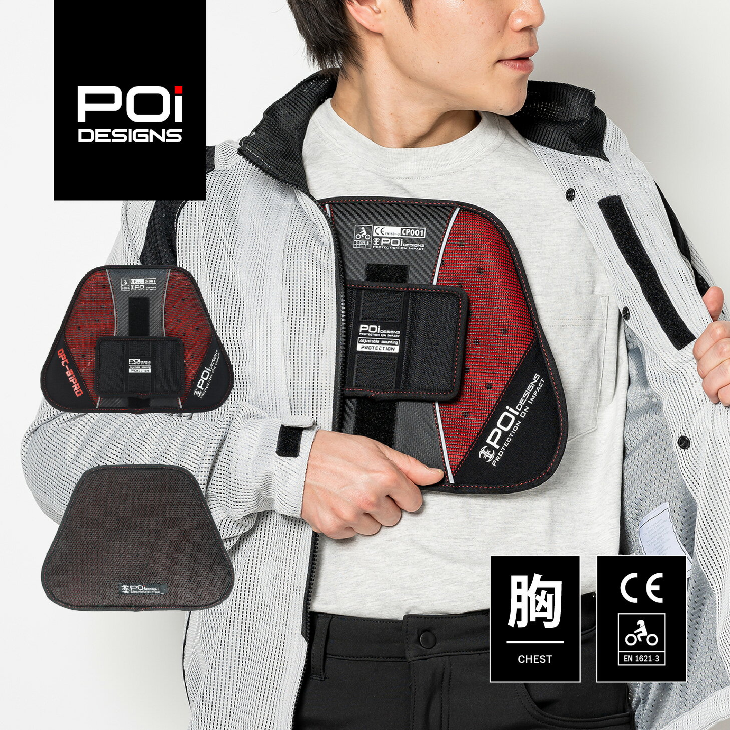 【公式】 バイク ピーオーアイデザイン POi DESIGNS プロテクター スポーツチェストプロテクター CE OPC-01-PRO 胸 2サイズ 衝撃吸収 CE規格 胸部プロテクター取付用の面ファスナーを採用しているライディングジャケットに装着可能な、ヨーロッパCE 規格(Level.1) をクリアした胸部用ソフトプロテクターです。 面ファスナーで装着する、汎用性の高いワンピースタイプの胸部用プロテクター。レーシングスーツなどプロテクターを入れるスペースがない方は「M」サイズがおすすめです。・CE 規格(Level.1) をクリアした柔軟性にも優れるソフトタイプのプロテクター。・プロテクター本体のエアホール加工で、通気性もよく軽量化にも貢献。・独自のマウント構造により、汎用性に優れた装着が可能。・胸部プロテクター取付用の面ファスナーを採用しているライディングジャケットに装着が可能です。・レーシングスーツはマウントプレートを取り外して装着できます。-------------------------------------------------------------品番:OPC-01-PRO/M・OPC-01-PRO/Lサイズ:M(W185mm×H230mm)・L (W245mm×H315mm)プロテクター:胸部CE規格:EN1621-3 LEVEL.1 5