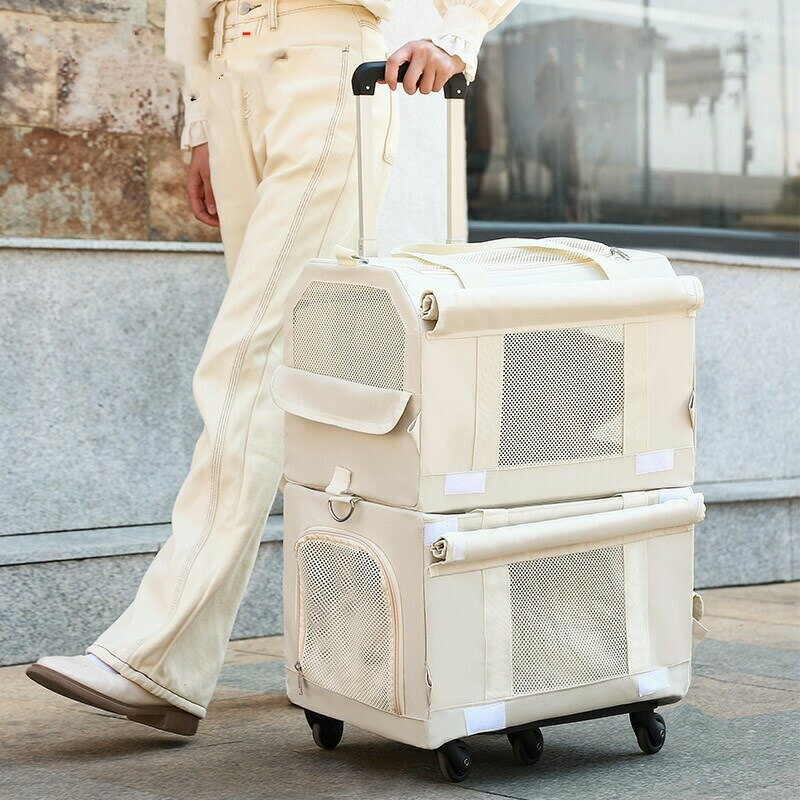 【最大4匹で移動できる2段式ペットカート】 上下二段はそれそれ独立した空間なのでペット同士が干涉せず、ストレスなく移動できます。 【各段分離可能取り外しカンタン】 電車や人ごみの移動は勿論、簡易八ウスとしてもお使いいただけます。大きなペットや長距離の移動におすすめです。 【折畳簡単】 フレーム部分はフンタッチで折り置みできます。 【通気性バッチリ7面メッシユ】 上段はフルオープンできるので、ペットの出し入れは勿論コミュニケ-ションもとりやすく! ペットの様子を見守りながら、お出かけできます.