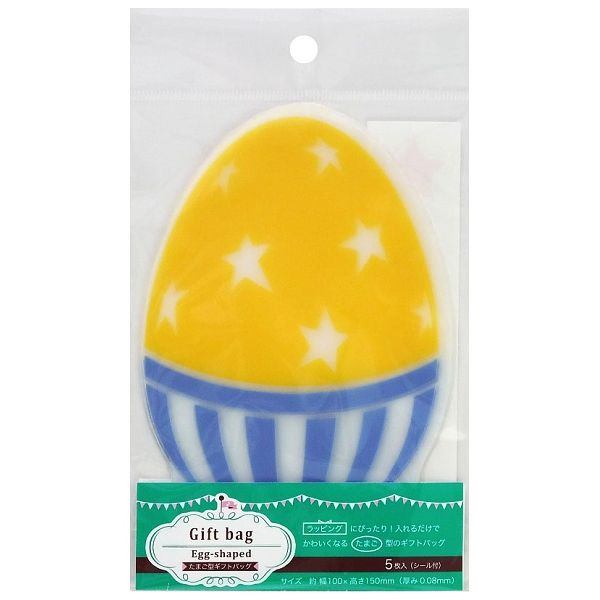 〇たまご型のギフトバッグ、5枚入りです。お菓子や小物をバッグの中に入れて、たまご型にラッピングできます。星型のシール付きです。※電子レンジ・オーブン・オーブントースター・冷凍庫 非対応※色の指定はできません●1枚のサイズ(約)・100×150×厚み0.08mm●耐冷−10度(本体)●材質・本体:ポリエチレン シール:紙●用途・ラッピング袋 プレゼント イースター 包装●キーワード・ぎふとばっぐ らっぴんぐ ぷれぜんと いーすたー 100均 100円均一●品名・たまご型ギフトバッグ 5枚●品番・7084●JAN・4978446070849●メーカー名・(株)まるき●管理単位・10個/360個●入数・ギフトバッグ、シール各5枚