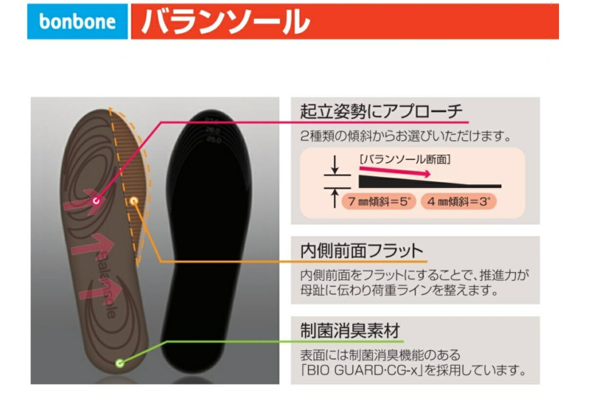 ※なお北海道・東北の場合、別途料金がかかります。(北海道・東北=300円) (例)送料込の商品価格+別途料金 定形外郵便(ポスト投函)を選択された場合は、別途送料はかかりません。(選択出来る商品と出来ない商品があります)バランソール製品特徴足底の重心は全身の骨格の影響を与えます。バランソールは本体に傾斜を設けることで、起立姿勢や歩行の重心をサポートします。傾斜は7mm傾斜(5°)と5mm傾斜(3°)の2種類の中からお選びいただけます。・起立姿勢にアプローチ傾いていた重心を、傾斜を用いることで理想的な重心位置へ移動するように働きかけます。・内側前面フラット内側前面をフラットにすることで、推進力が母指に伝わり荷重ラインを整えます。・制菌消臭素材表面には制菌消臭効果のある「BIO GUARD・CG-x」を採用しています。・サイズ調整カットライン本体裏面のカットラインに合わせ、つま先部分をカットすることで、サイズの微調整が可能です。インソールをカットする際は、必ずご使用になる靴に合う様に調整しながらカットしてください。 ■バランソール品番(7mm傾斜)品番(4mm傾斜)サイズ靴サイズ入数d0005053d0005063M25.0〜28.0cm1ペアd0005054d0005064S22.5〜24.5cm●カラー/ブラウン