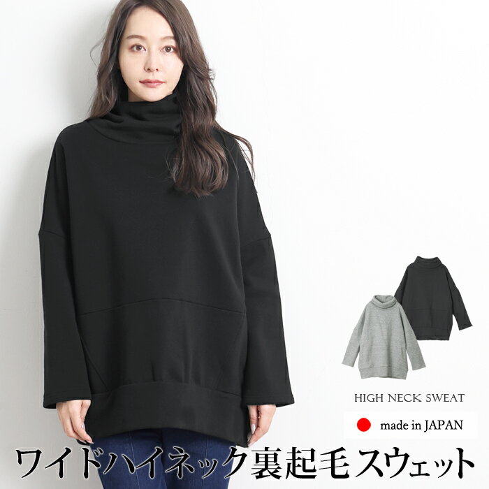 裏起毛 スウェット あったか 日本製 ハイネック●トップス レディース プルオーバー 綿 長袖 プルオーバー トレーナー 無地 大人 上品 おしゃれ カジュアル グレー ブラック[51298]【3980円以上送料無料】