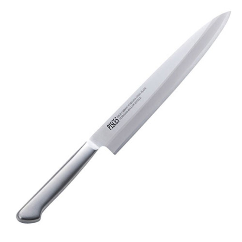 パイシーズの刺身包丁 シルバーカラーでスタイリッシュなデザイン。ステンレス製のハンドルで衛生面において大変優れています。 メーカー品番 : A-40M 材質 : モリブデンステンレス刃物鋼、柄…ステンレススチール サイズ : 刃渡20cm 本体重量 : 約100g 生産国 : 日本