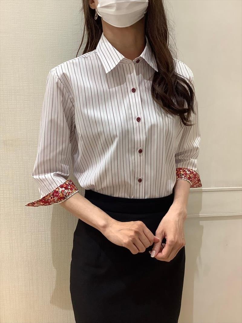 レディースシャツ 衿回り 肩幅 バスト ウエスト 着丈 長袖裄 七分袖裄 半袖裄 XS 35 36 89 74 63 73 59 36 S 36 38 92 79 64 76 60 37.5 M 37 40 95 83 64 77 61 39.5 L 38 42 100 89 65 78 61.5 40.5 LL 39 44 105 95 65 79 63.5 42.5 XL 40 46 116 106 65 79 65 43.5 ※「衿回り」は台衿ボタンが付いている衿型の寸法となります。 【レディース七分袖】【花柄別布】 メーカー希望小売価格はメーカー商品タグに基づいて掲載しています 【BHセール限定】【七分袖セール限定】【sale20250704】【RSS2512】裾に縁取るパイピング仕様がお洒落。 大人可愛いカラフルな花柄別布が 裏側の別布仕様・表側のパイピング 仕様に使用され、ワイシャツ全体を 華やかに彩ってくれます。 ボトムスにインせずに着用する 方に特におすすめしたい一枚。 形態安定加工とポリエステル×綿 素材で、クリーニング要らずの 自宅で取扱い楽ちんのワイシャツ。 ポリエステルがメインの素材なので きちんと感あるかっちりとした 着こなしをお楽しみ頂けます。 スキッパー衿 ポリエステル65% 綿35% 形態安定加工 カフリンクス使用不可シングル・イッテコイ仕様前身頃ダーツなし・後身頃ダーツあり台衿内側・カフス裏側:別布仕様裾:パイピング仕様 ベトナム ※別布を含む濃色生地は色落ち・移染が 発生する場合があるため、お洗濯時は 衣類の組合わせにご注意ください。 2024年8月6日
