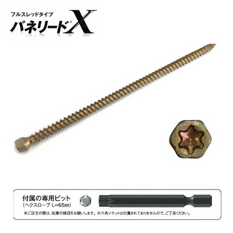 特殊形状により、驚きの施工性を実現 先端特殊形状により、下穴無しで施工可能 WAXコーティングにより、打ち込みの摩擦抵抗を軽減しスムーズな施工が可能 太く長いビスでもストレスのない施工の実現 ビットは回転トルクが無駄なく伝わり、ネジ頭の破損が起きにくいヘクスローブを採用 東武を六角頭にすることで六角ソケットでも施工が可能(パネリードXのみ) 施工例 重ね梁・土台-柱接合・柱-梁接合・パネル接合 付属:専用ビットヘクスローブ L=65mm 一本よく一緒に購入されている商品外張り断熱工法壁施工用木ねじ パネリード2 P38,825円類似商品はこちらパネリードX 100本入 PX8-320 専用63,521円パネリードX 100本入 PX8-290 専用51,909円パネリードX 100本入 PX8-260 専用41,957円パネリードX 100本入 PX8-170 専用27,027円パネリードX 100本入 PX8-230 専用32,690円パネリードX 100本入 PX8-110 専用15,645円パネリードX 100本入 PX8-140 専用22,880円パネリードX 200本入 PX6-170 専用25,369円パネリードX 200本入 PX6-140 専用19,792円2025/10/23 更新【メーカー在庫となります。在庫切れの場合はご連絡させていただきます】【北海道・沖縄・離島送料別途見積もり商品】【お客様都合の返品の場合返品手数料がかかります】