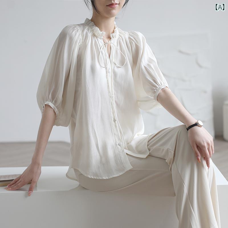 トップス シフォン シャツ 春夏 レディース ブラウス トップス シフォン シャツ 春夏 レディース ブラウス 韓国 高級 ヘビーデューティー ビーズ オフショルダー シャツ 夏用 プリーツ入り ゆったり パフスリーブ ベビー ドール 付き