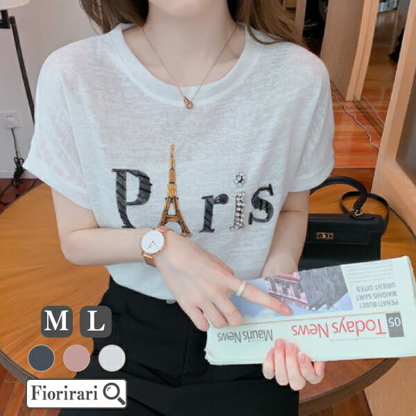tシャツ レディース 半袖 カジュアル ロゴTシャツ 夏 薄手 白 ピンク グレー トップス おしゃれ ロゴ 英字 デザインT ビジュー 普段着 30代 40代 50代 60代 ゆるシルエット ビーズ 華奢見え 高見え きれいめ お洒落 paris ビジュー
