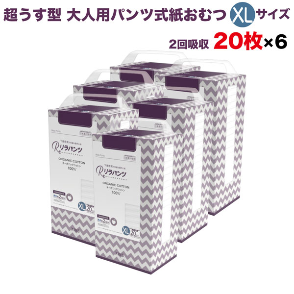 リラパンツ 大人用おむつ 薄型 紙オムツ 紙パンツ オーガニックコットン 2回吸収 XL 20枚入×6セット 尿失禁 尿漏れ 吸収量多い 介護 男性用 女性用 使い捨て 災害 120枚 大人用パンツ リハビリパンツ 男女共用 パンツタイプ 超うす型設計 失禁パンツ 介護用おむつ 大容量