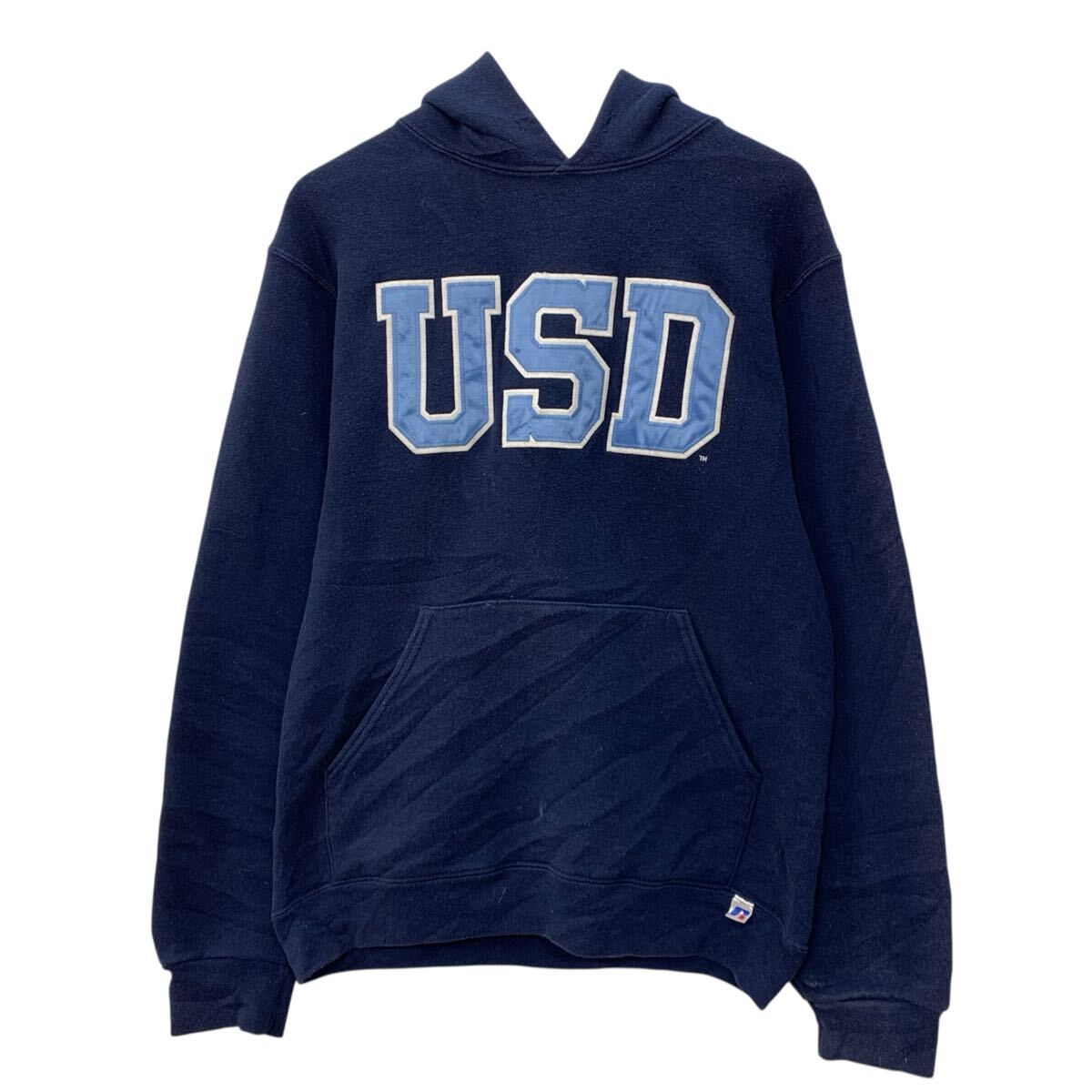【中古】【古着】 RUSSELL ATHLETIC ロゴスウェット パーカー S ネイビー ラッセルアスレティック プルオーバー フーディー ビックロゴ 秋物 a802-5366
