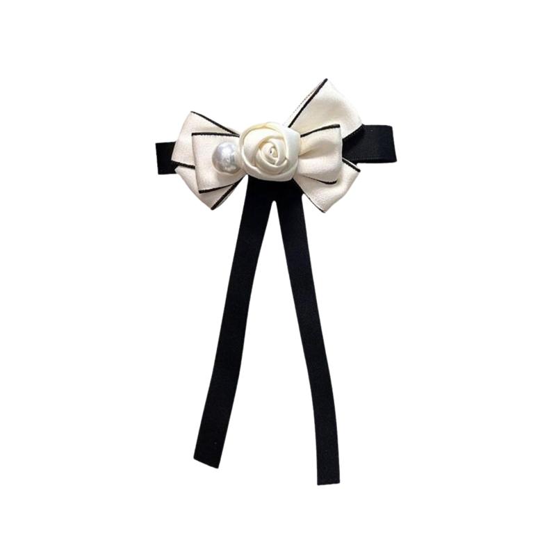 【送料無料】EZ PEACH ブローチ ブローチピン ヘアアクセサリー ネクタイブローチ 制服リボン クリスタルリボンタイ リボン バレッタ ブラック OL 女性 ガールズ ビンテージ 入学式 卒業式 卒園式 フォーマル 結婚式 上品 装飾ファッション愛好家のため な装いに (黒+しろ/椿