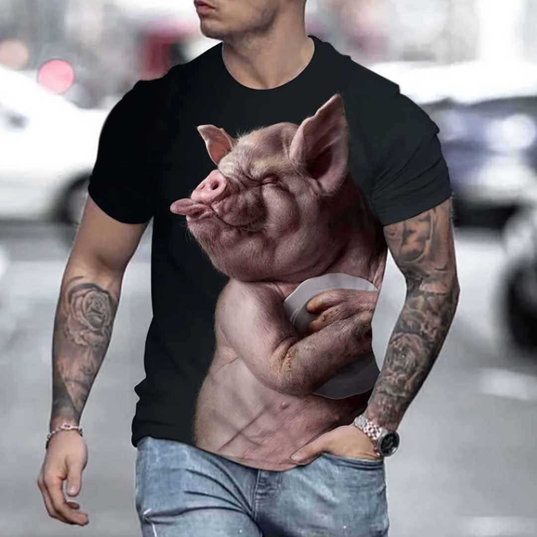 Tシャツ 半袖 メンズ トップス タトゥー 豚柄 パンク ピッグ 蛍光 綿 プリント 黒 アニマル 男性用