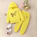 キッズ 女の子 長袖 フード付き キャラクター 蝶々 スウェット プルオーバー パンツ セットアップ 春秋 普段使い お出かけ 2点セット ポリエステル ソフト生地 かわいい ブラック グレー イエロー パープル ピンク