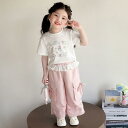 キッズ 女の子 薄手 セットアップ 春夏 韓国風 Tシャツ ロングパンツ 2点セット かわいい キャラクター フリル カジュアル おしゃれ 綿混 ピンク ジュニア