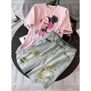 セットアップ レディース 春夏 ピンク ブルー キャラクター 立体デザイン ダメージ デニム ショートパンツ コットン カジュアル スポーティー ツーピース 普段使い