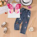 セットアップ 女の子 キッズ ピンク キャラクタープリント 半袖 Tシャツ ポリエステル デニム ロングパンツ 上下セット 柔らかい カジュアル 春夏 お出かけ 通学