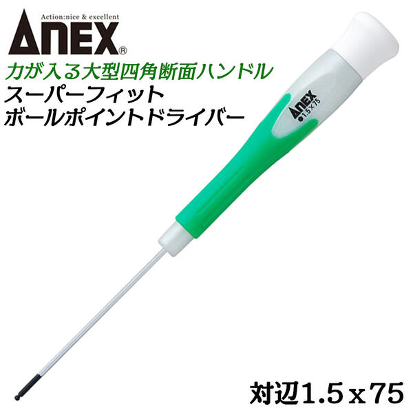 ANEX スーパーフィットボールポイントドライバー 1.5mm 全長75mm エラストマーグリップ 全鋼全体焼入 大型四角断面形状ハンドル 高精度ブラックポイント ボールポイントレンチ 斜めがけ 精密機器 HEX 1.5 日本製 #3530 兼古製作所