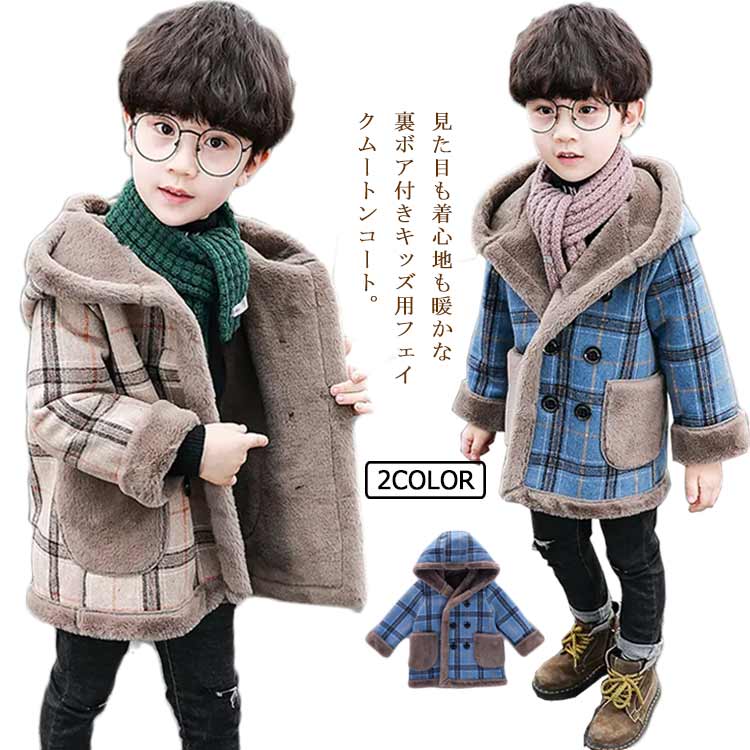 見た目も着心地も暖かな裏ボア付きキッズ用フェイクムートンコート。デザインベースはダブルのPコートをベースにフード付きにして、防寒性をアップ。しっかり裏地!綿だから柔らかくて動きやすいからお子さんが嫌がりません!定番のチェック柄で、長時間着用してもストレスなく過ごせる軽い着心地が魅力。トレンド感のあるおしゃれ着にも、いつもの通園通学コーデにも合わせやすいようシンプルなデザインに仕上げました。 サイズ90 100 110 120 130 140 150 160サイズについての説明「90」 着丈46 バスト35*2 袖丈31 「100」着丈49 バスト37*2 袖丈34 「110」着丈52 バスト39*2 袖丈37.5 「120」着丈55 バスト41*2 袖丈40.5 「130」着丈58 バスト43*2 袖丈43.5 「140」着丈61 バスト45*2 袖丈46.5 「150」着丈64 バスト47*2 袖丈49.5 「160」着丈67 バスト47*2 袖丈49.5 ※サイズ表の実寸法は商品によって1-3cm程度の誤差がある場合がございます。素材メルトン ポリエステル色ブルー ベージュ備考 ●サイズ詳細等の測り方はスタッフ間で統一、徹底はしておりますが、実寸は商品によって若干の誤差(1cm〜3cm )がある場合がございますので、予めご了承ください。 ●商品の色は、撮影時の光や、お客様のモニターの色具合などにより、実際の商品と異なる場合がございます。あらかじめ、ご了承ください。●製品によっては、生地の特性上、洗濯時に縮む場合がございますので洗濯時はご注意下さいませ。▼色味の強い製品によっては他の衣類などに色移りする場合もございますので、速やかに(脱水、乾燥等)するようにお願いいたします。 ▼生地によっては摩擦や汗、雨などで濡れた時は、他の製品に移染する恐れがございますので、着用の際はご注意下さい。▼生地の特性上、やや匂いが強く感じられるものもございます。数日のご使用や陰干しなどで気になる匂いはほとんど感じられなくなります。