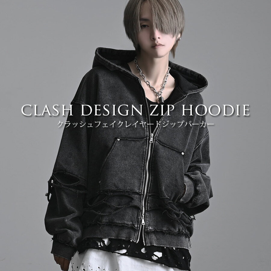 "CV Select【シーブイセレクト】クラッシュ加工フェイクレイヤードダブルジップアップパーカー/全1色"パーカー ジップアップ 地雷系 サブカル系 Y2K ピープス系 ゴシック ヴィジュアル系 V系 病み メンズ レディース 黒 ブラック ファッション 服 短丈