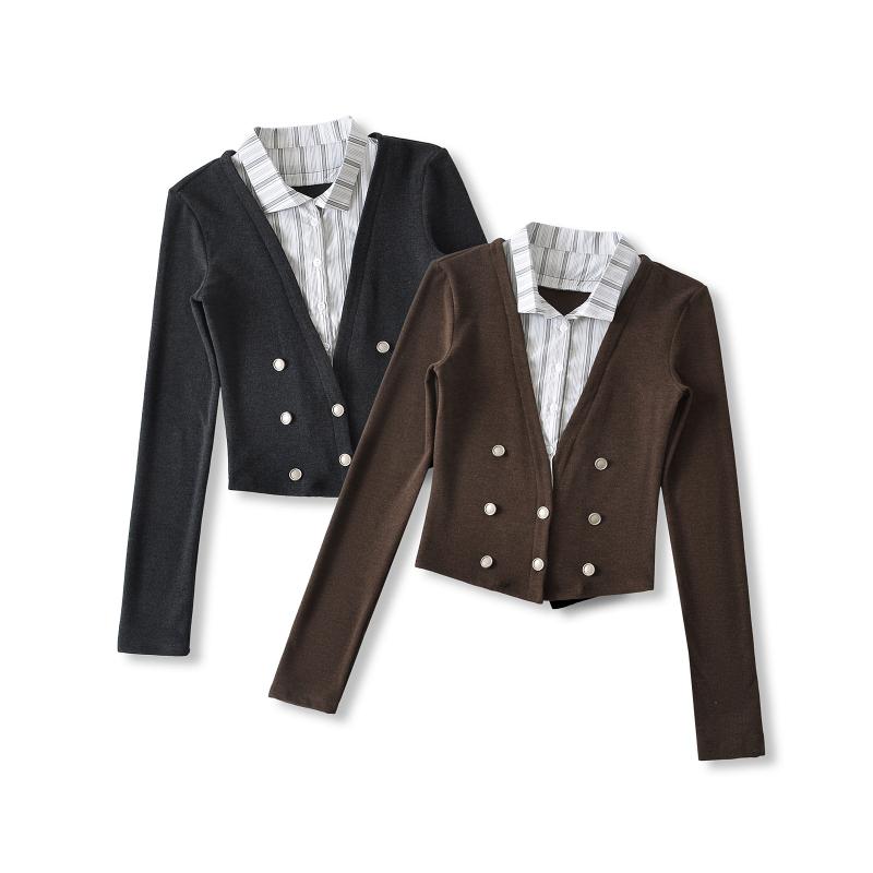 ブラウス レディース 秋冬 欧米風 フェイクレイヤード ダブルブレスト 切り替え ニット 長袖 きれいめ オフィス 通勤 大人カジュアル 上品 エレガント デザイン ポリエステル ストレッチ ブラウン ブラック