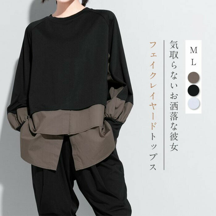 フェイクレイヤード tシャツ 長袖 レディース トレーナー 異素材 スウェット 切り替え 長袖 トップス プルオーバー 大きいサイズ 体型カバー 無地 通勤 秋 冬 春 春秋 シンプル 上品 着回し 個性的 フェミニン モード 原宿系 きれいめ 30代 50代 40代 黒 ブラック 白