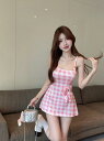 ワンピース 低身長 小柄な女性向け ピンク チェック柄 セクシー かわいい フェミニン キャミソール バックオープン ハートデザイン ミニ丈 ストレッチ Uネック ポリエステル 春夏