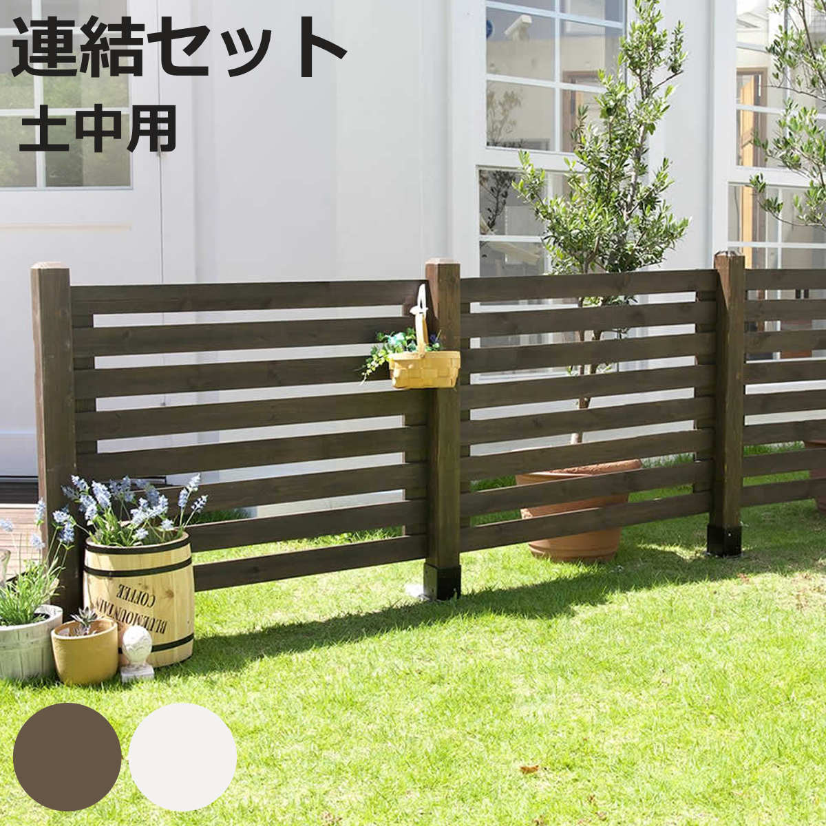 サイズフェンス1枚あたり:約 幅107×奥行2.7×高さ78(cm)ポール:約 幅7.4×奥行7.4×高さ95(cm)土中用金具:約 幅14×奥行14×高さ46(cm)重量フェンス:約3.2kgポール:約1.6kg土中用金具:約1.6kg内容量連結セットフェンス×1、ポール×1、土中用金具×1材質天然木杉材(ステイン塗装)種類ダークブラウン、ホワイト生産国中国製組立状態完成品注意事項※商品ページ内には別の商品を含む画像を使用しています備考ステイン塗装によるホワイト色は、木目や地目が見えるウォッシュホワイト仕上げとなります。区分返品・キャンセル区分(不可)フェンス ボーダーフェンス スプレッド 連結セット 土中用※こちらは、連結セット土中用の販売ページです。おすすめポイント見栄えが違うボーダーフェンス爽やかでナチュラルな雰囲気があり、モダンやスタイリッシュ、フレンチカントリーにもマッチする使いやすさが魅力の木製ボーダーフェンスです。ちょうどいいボーダーの間隔が圧迫感なく、ほどよい目隠しになるので、防犯にも役立ちます。気軽に花の水やりや小さなお子さんも安心してお庭で遊ぶことができて、簡単に癒しのプライベートガーデンが作れます。連結セット:フェンス×1、ポール×1、土中用金具×1お庭に合わせて連結できるフェンスを連結してお庭や設置したい場所に合わせて、お好きなサイズで設置できます。別売りのコーナー用ポールを使用すると、直角に設置することもできます。※コーナーに設置する場合、フェンス表面が内側に向く設計となります。商品詳細パッと明るい印象のウォッシュホワイト真っ白ではなく木目がうっすら透けて見えるウォッシュホワイト色は、設置するだけでお庭がパッと明るい印象に。色とりどりの花と合わせるだけで、地中海の邸宅風になります。シンプルシックなダークブラウン天然木の印象的な木目が特徴のダークブラウン色は、連結するほどにおしゃれで、家そのものを美しく輝かせ引き立ててくれます。気軽にお庭のイメージチェンジ届いたその日におしゃれなフェンスが設置できます。専用金具で簡単に取り付けができるので、気軽にお庭のイメージチェンジができます。土中用金具は、土中部分を外せば平地用金具としてお使いいただけます。カラーサイズご注意点単品・セットの購入はこちら土中用 単品土中用 4個土中用 8個対応しているパーツ・オプションポール95cm(ストレート) 10本セットポール95cm(コーナー) 10本セットポール176cm(ストレート) 6本セットポール176cm(コーナー) 6本セットシリーズ紹介基本セット 土中用基本セット 平地用連結セット 平地用関連キーワード:ガーデニング用品 天然木製 カフェ 店舗 diy キット 支柱 敷地 農園 境界 菜園 囲い ガーデン 屋外 オーナメント ディスプレイ オブジェ 置物 デザイン シンプル クラシック フレンチ ナチュラル 加工 レトロ シャビー 玄関先 玄関 インテリア雑貨 庭先 ビンテージ オシャレ スタイリッシュ 園芸グッズ 園芸用品 園芸 ガーデニンググッズ 置き物 おすすめ オススメ LH16477 関連商品はこちらフェンス ボーダーフェンス スプレッド 土中 76,800円フェンス ボーダーフェンス スプレッド 土中 42,000円フェンス ボーダーフェンス スプレッド 基本セ15,800円フェンス ボーダーフェンス スプレッド 連結セ9,200円フェンス ボーダーフェンス スプレッド 平地 62,000円フェンス ボーダーフェンス スプレッド 平地 35,800円フェンス ピケットフェンス ストレート 連結セ14,300円フェンス ボーダーフェンス スプレッド 基本セ13,200円フェンス ピケットフェンス ストレート 土中 120,000円フェンス ピケットフェンス ストレート 土中 62,800円フェンス ピケットフェンス U型 連結セット 14,300円フェンス ピケットフェンス U型 土中 8連結120,000円