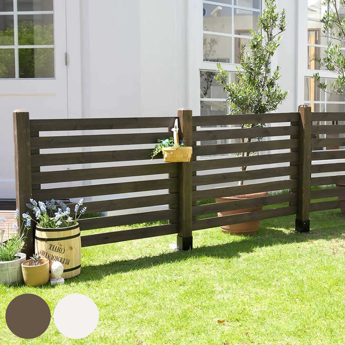 ※ご購入金額・お届け先により別途運賃が発生する場合があります。【ボーダーフェンス スプレッド(フェンス単品販売)】新鮮!見栄えが違うボーダーフェンス自分で木製フェンスを設置するなら、断然ボーダーがおすすめです。爽やかでナチュラルな雰囲気があり、モダンにも、スタイリッシュにも、フレンチカントリーにもマッチする使いやすさが魅力。ボーダーの間隔が絶妙で、圧迫感がなく、ほどよい目隠しとなるので、防犯に役に立ちます。気軽に花の水遣りができますね。小さなお子さんも、お庭で安心して遊べそうです。自分で手がけた愛着のある簡単DIYフェンスで、癒しのプライベートガーデンを作りませんか。■商品名ボーダーフェンス スプレッド(フェンス単品販売) ■カラー・型番 ダークブラウン…SFBF1000DBR ホワイト…SFBF1000WHT ■サイズ 幅 約1070×奥行 約27 高さ 約780mm ■重量 約3.2kg(1枚) ■材質 杉材・天然木 ■仕上げ ステイン塗装 ■組立区分 完成品 ※設置には作業が必要です。 ■生産国 中国 ■備考 ステイン塗装によるホワイト色は、木目や地目が見えるウォッシュホワイト仕上げとなります。画像で判断しにくい部分がございますが、ご注意ください。