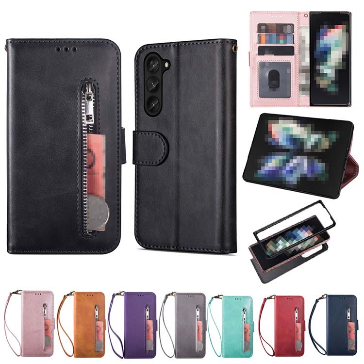 Galaxy Z Fold5 ケース カバー 手帳型 PUレザー スタンド機能 カード収納 ストラップ付き Samsung サムスン ギャラクシー Z フォールド5 アンドロイド ファスナー付きポケット おすすめ おしゃれ スマートフォン/スマホケース/カバー