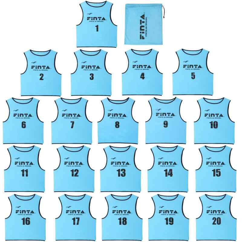 [フィンタ] FINTA サッカー フットサル ジュニア・子供用 ビブス ゲームベスト 20枚セット FT6557 (2200) サックスサッカーを愛して止まない国ブラジル発の人気サッカーブランド・FINTAのサッカー、フットサル用のジュニアサイズのビブス、ゲームベスト20枚セット。ゼッケンは1〜20の通し番号。下に着たウェアの色が透けにくい特殊なメッシュ素材を使用。耐久性が高く、洗濯をしてもほつれにくくや色落ちがしづらいので、長く使用できます。収納バッグ付き。【カラー】全4色 サックス、イエロー、オレンジ、ピンク【セット内容】大人用ビブス20枚(1〜20のゼッケン前後プリント)、同色の収納バッグ【サイズ】子供用フリーサイズ 前着丈:52cm、後着丈:55cm、身幅46cm【素材】ポリエステル100%(吸汗速乾素材)【生産国】中国