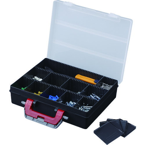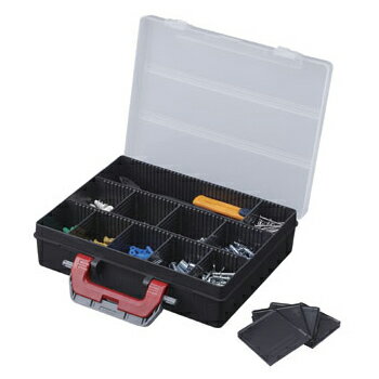 ジェフコム 072-986-5900 ●ハンドルをスライドするだけの簡単ロック! ロックも解除もワンタッチでOK!●工具・ビス・アンカーを一括収納●7mmの仕切りピッチで、お好みの収納スペースが作れます●高耐衝撃性仕切り付(12枚)コーポリマー使用!強度抜群!●材質:(フタ・本体)高耐衝撃ポリプロピレン (取手)ABS樹脂サイズ(mm)●サイズ(mm):幅342×奥行290×高さ90●質量:1.2kg